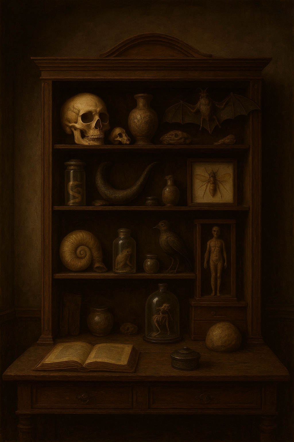 Nés à la Renaissance, les cabinets de curiosités étaient des lieux où érudits, artistes et explorateurs rassemblaient des objets rares, étranges ou précieux venus du monde entier. Mélange de sciences, d’art et de mystère, ces collections privées mêlaient minéraux, animaux naturalisés, artefacts anciens, et merveilles naturelles — reflet d’une soif de connaissance et d’émerveillement face à l’inconnu.