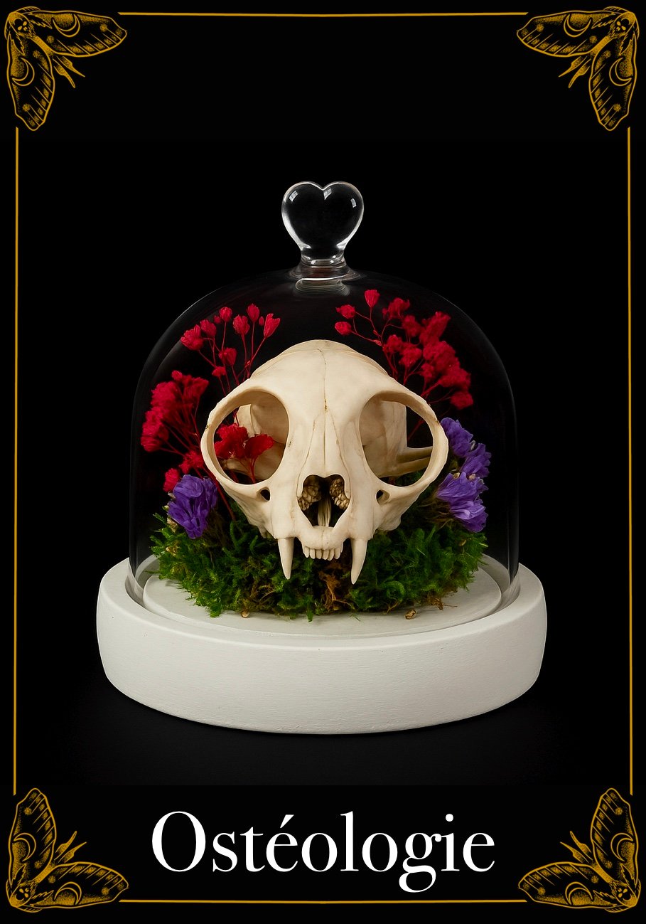 Nous vous proposons une sélection de crânes d’animaux décorés, insectes naturalisés, ossements, fragments organiques et objets rares, soigneusement travaillés ou présentés dans le respect de leur essence. Chaque pièce est unique, sélectionnée ou transformée à la main, avec une approche mêlant esthétique, symbolique et résonance spirituelle.